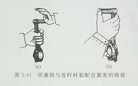 對發電機組而言,一般的檢驗方法是:將活塞銷涂以機油,能用手掌的力量把活塞銷推入連桿襯套,并且沒有間隙的感覺,則認為松緊度為合適[如圖3-61(a)];對發電機組而言,一般的檢驗方法是:將活塞銷涂以機油,能用大拇指的力量把活塞銷推入連桿村套,并且沒有間隙的感覺,則認為松緊度為合適[如圖3-61(b)];接觸面積在75%以上,并且接觸點分布均勻,輕重一致,則認為接觸面符合要求。
