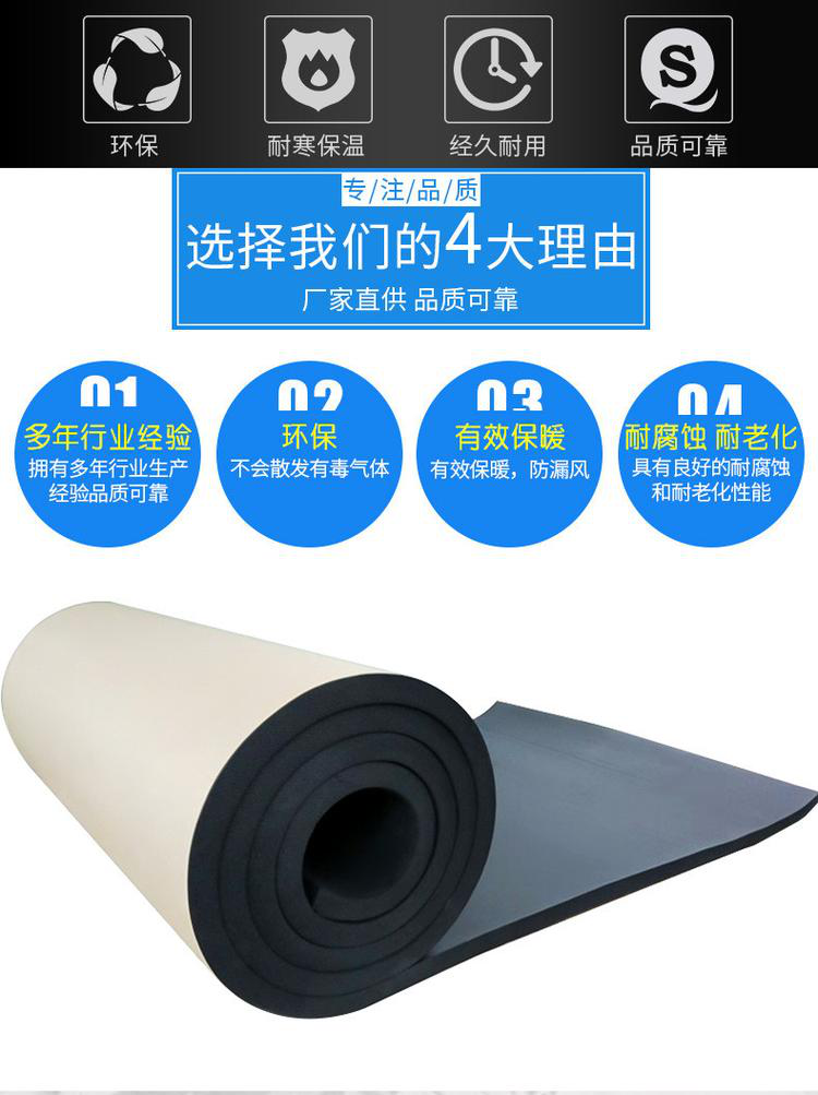 3、專用膠水的自然干化時間為3-10分鐘,時間的長短取決于膠水的等級、大氣的溫度和濕度,且阻燃橡塑板性能好,應用廣泛,且橡塑板遵循:環境溫度越高,相對濕度越大,介質溫度越低,橡塑泡沫板管道直徑越大等材料就應越厚。