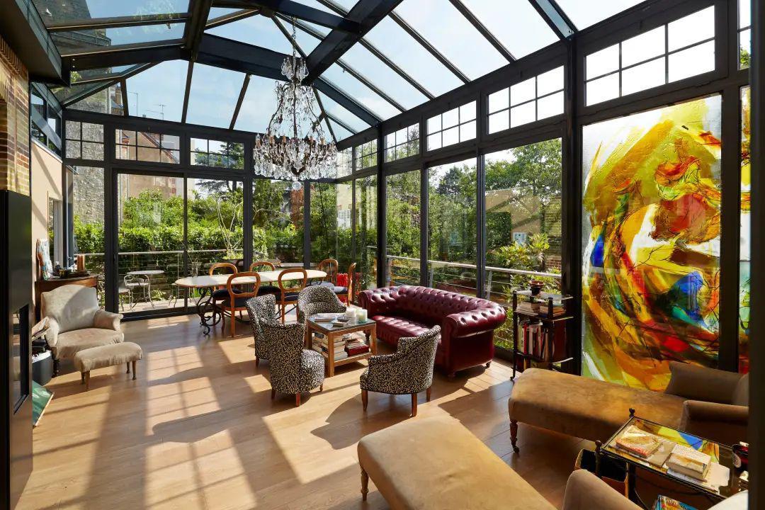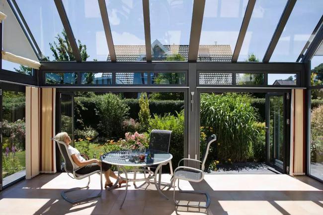 多功能陽光房設計將將休閑、會客、娛樂、融為─體,可以在多功能陽光房的四周圍種植許多大大小小的綠色植物,打造一片郁蔥之景,花草可以吸收透過玻璃射入的自然光線。想要陽光房中做到冬暖夏涼,窗框的選擇是很重要的要素。而使用鋁合金材質做窗框,可以很好的做到保溫隔熱,充惰性氣體的中空鋼化玻璃還能最大程度阻止熱量的外泄。
