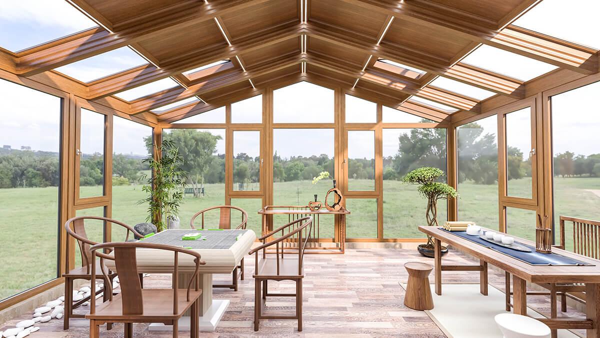 新中式陽光房效果圖設計是通過對傳統古典文化的認識,將傳統元素運用在新中式陽光房效果圖設計,與現代元素融合在一起,形成新中式陽光房設計。