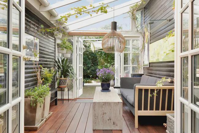 玻璃陽光房效果圖采用斜頂的造型,木制的家居與綠植,流露出一股清新和自然的感覺,整體氛圍簡潔、溫馨、活潑。緊挨著房屋而建,第二個門通往院后花園。可以坐在沙發上看著夜晚的星空,那是多么愜意的享受。