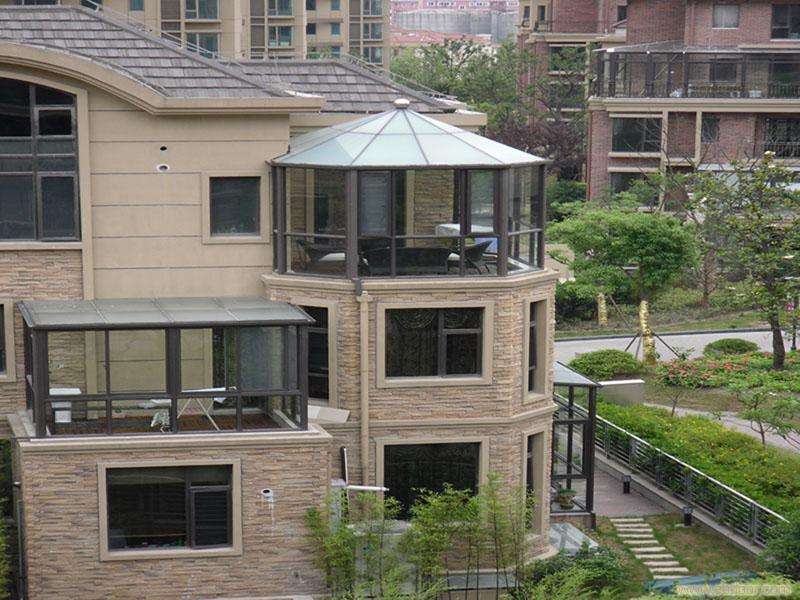 如果使用PVC窗或鋁合金窗,大量塑料和金屬結構組合,使人們在其間的感覺就十分生硬,而且陽光房對門窗框材強度、抗老化、保溫要求更高,大多數PVC和鋁合金門窗都無法達到陽光房的功能要求。在高層陽光房上,采用向外開啟的美式門窗,風壓越大密封越好,而內開歐式窗和推拉窗基本上失去了氣密、水密效果。
