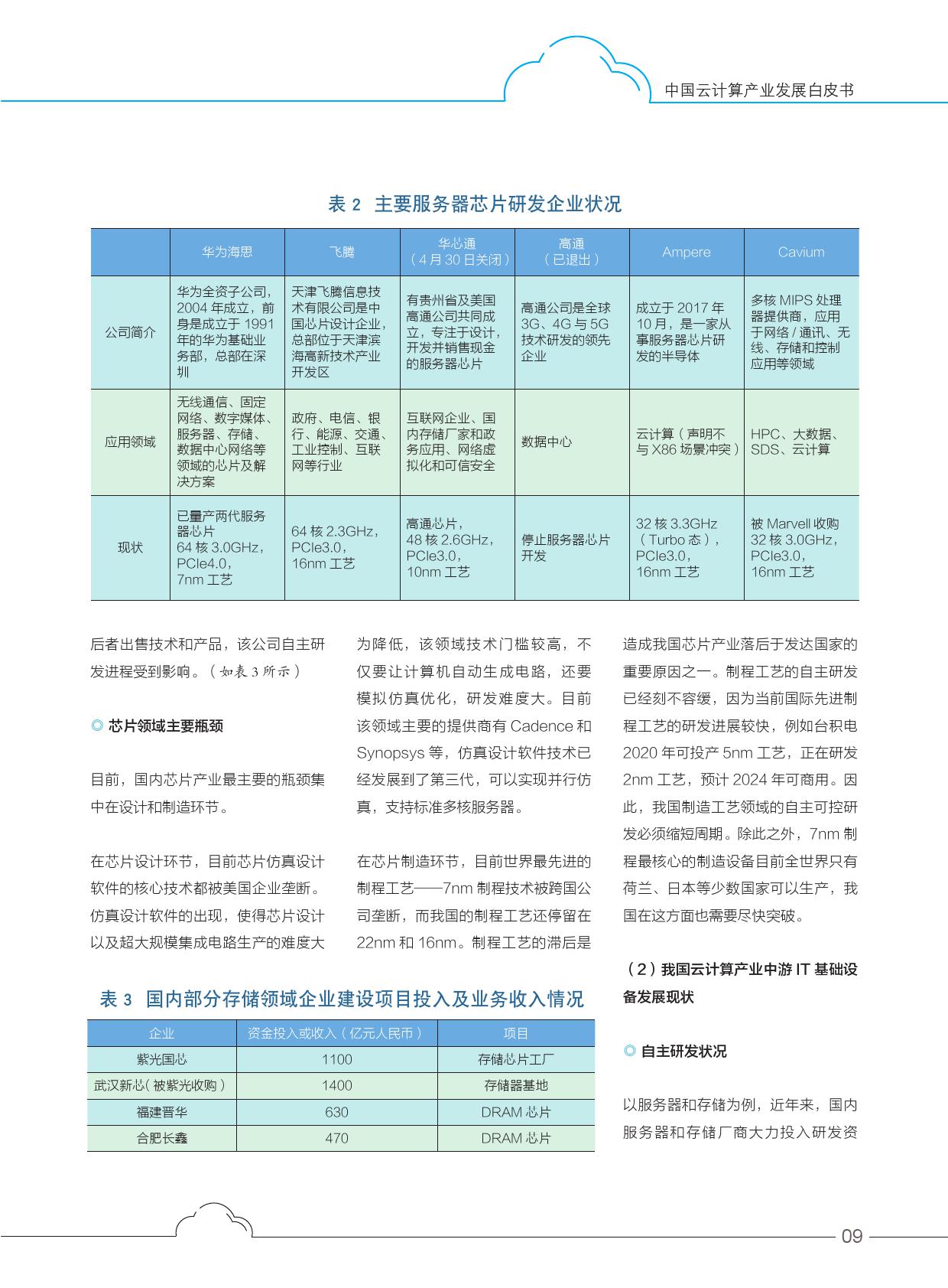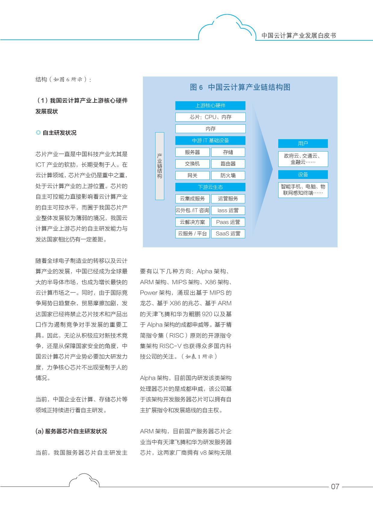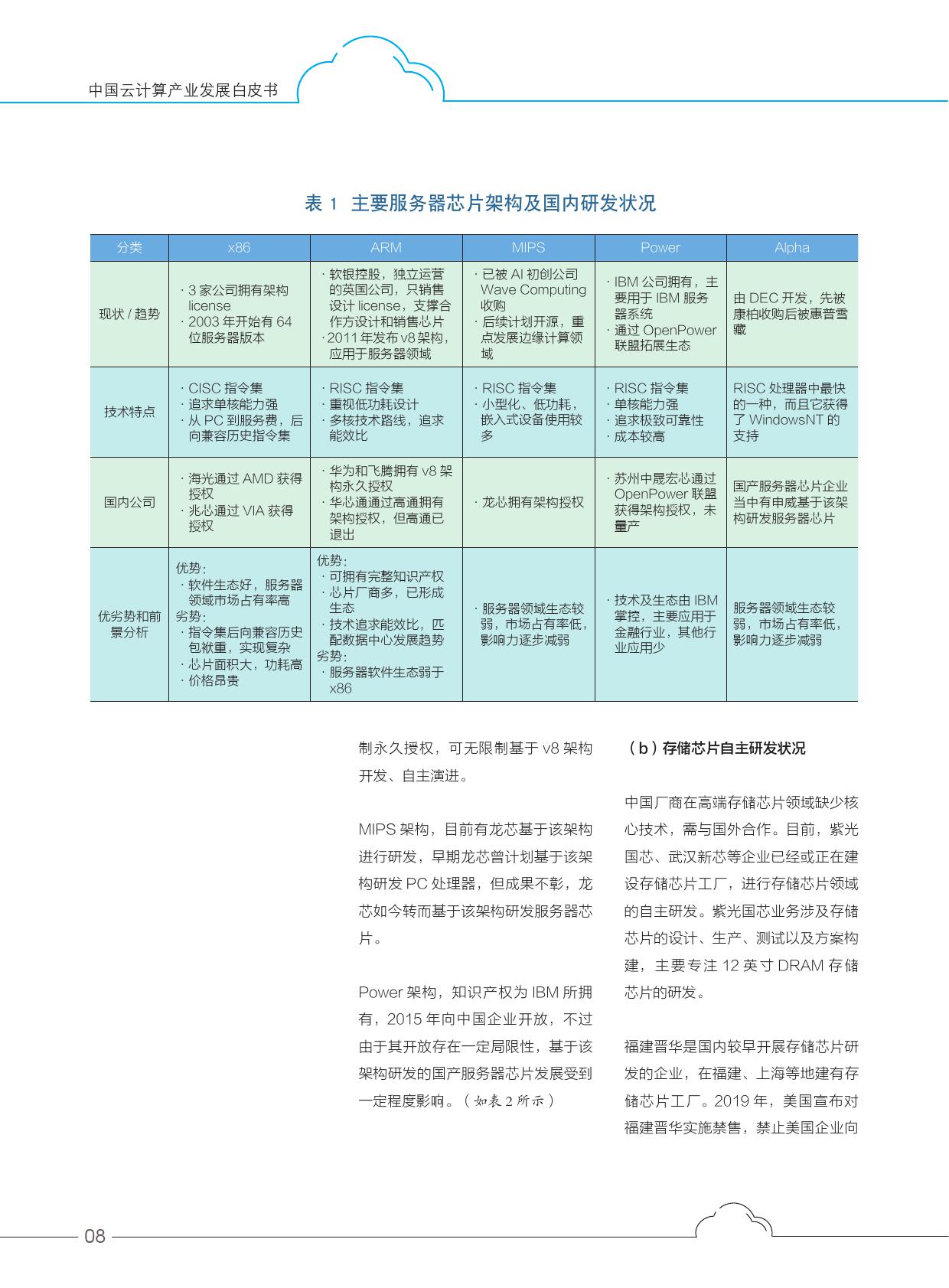 上游核心硬件方面,在云計算領域,芯片產業仍是重中之重,處于云計算產業的上游位置,芯片的研發力直接影響著云計算產業的發展水平。而囿于我國芯片產業整體發展較為薄弱的境況,我國云計算產業上游芯片的自主研發能力與發達國家相比仍有一定差距。這里的芯片包括服務器芯片和存儲芯片。我國服務器芯片自主研發主要有以下幾種方向:Alpha架構、ARM架構、MIPS架構、X86架構、Power架構,涌現出基于MIPS的龍芯、基于X86的兆芯、基于ARM的天津飛騰和華為鯤鵬920以及基于Alpha架構的成都申威等.基于精簡指令集(RISC)原則的開源指令集架構RISC-V也獲得眾多國內科技公司的關注。
