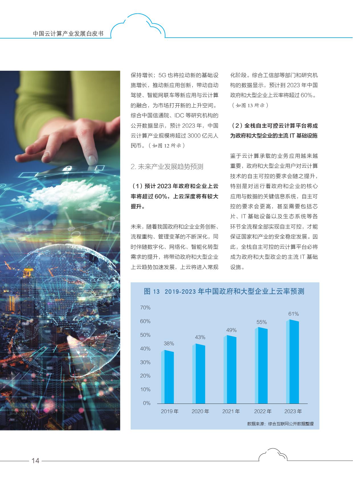 在產業規模方面,數字經濟將是引領中國云計算產業快速發展的重要推手。在技術應用領域,新技術和新應用的交叉融合也將給云計算市場帶來新的活力,邊緣計算、面向人工智能和機器學習的并行發展有望繼續拉動市場保持增長;5G也將拉動新的基礎設施增長,推動新應用創新,帶動智能網聯車等新應用與云計算的融合,為市場打開新的上升空間。綜合中國信通院、IDC等研究機構的數據,我們預計到2023年,中國云計算產業規模將超過3000億元人民幣。在產業發展趨勢方面,預計2023年政府和企業上云率將超過60%,上云深度將有較大提升。