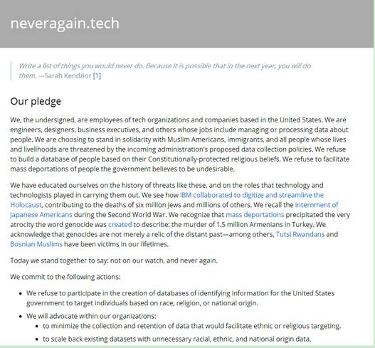 國人所熟知的美國近期發生的最火爆事件莫過于特朗普當選美國新一屆總統。然而,廣大美國百姓著實是反對聲一片,美國科技界為此還專門上線了一個neveragain.tech的請愿網站,通過征集科技界大佬、雇主、企業員工的簽名,以抵制特朗普的一系列政策,當前至少已有超過2000人在網上簽名。