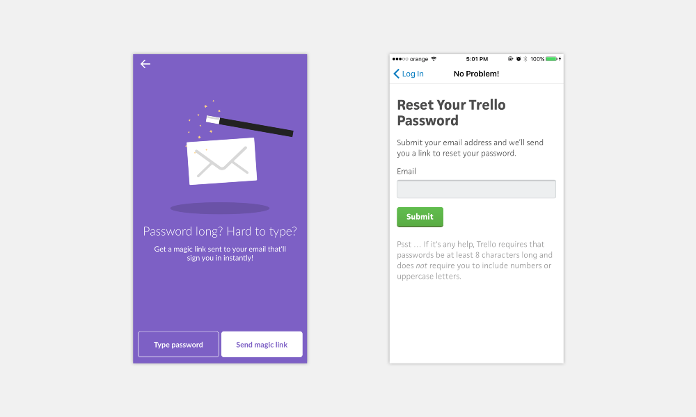 沒(méi)人愿意重置密碼,除非登錄失敗或者賬號(hào)被盜。這么看來(lái),如何幫助用戶在不重置密碼的情況下登錄進(jìn)去呢?發(fā)送一個(gè)短鏈接,允許用戶不重置密碼而直接登錄。提示:利用好細(xì)微文案,但要和整體的語(yǔ)調(diào)保持一致。