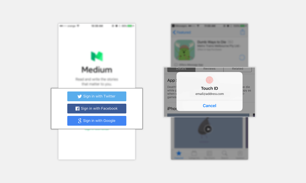 密碼總是很麻煩,所以還有個(gè)辦法是根本不用密碼。要么使用外部驗(yàn)證手段,例如社交媒體賬號(hào)登錄,或者利用指紋識(shí)別。比如說(shuō),在App Store里購(gòu)買一直都是用指紋的。