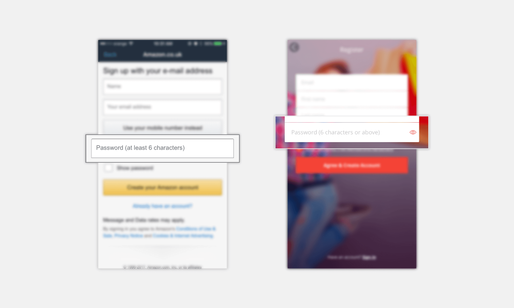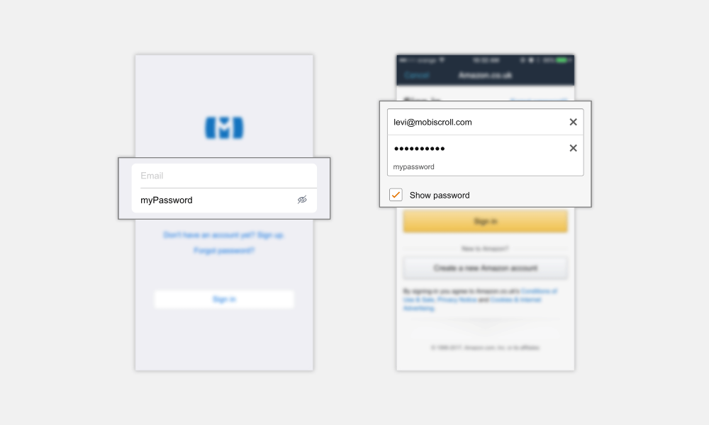 可以考慮讓密碼可見。這對(duì)用戶登錄和注冊(cè)有幫助。不用再次輸入確認(rèn),用密碼輸入框來(lái)切換顯示隱藏,幫助用戶確認(rèn)首次輸入是否正確。顯示和隱藏的功能可以用一個(gè)小圖標(biāo)、一行文字標(biāo)簽、或者勾選框來(lái)表示。亞馬遜對(duì)此做了些小變化,把隱藏字符保留在輸入框里,在下方顯示完整密碼。增強(qiáng)了用戶的信心,減少焦慮,表達(dá)出密碼被妥善處理的事實(shí)。