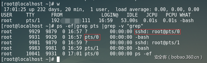 我們可以看到當攻擊者處理掉自己的記錄后,管理員雖然通過w、who看不到,但是進程中卻存在著攻擊者登錄申請的TTY。