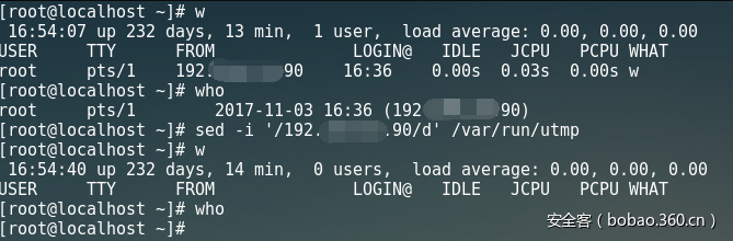 當然,這樣操作會造成整個utmp為空,如果是在管理員登錄之后再操作的話,還是會發(fā)現(xiàn)異常的。