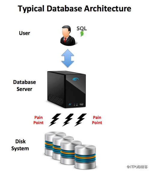 Hadoop底層架構中的HDFS和MppReduce給它帶來了兩大優勢——可擴展性和大規模并行處理(MPP)能力。下圖是一個典型的數據庫體系架構,用戶對單個大型數據庫服務器執行SQL查詢。盡管已經有了各種復雜的緩存技術,但大多數商業智能應用程序的瓶頸依然出現在數據從磁盤提取到內存的過程,這限制了系統的處理和擴展能力,使其難以應對快速增長的龐大數據集。由于只有一臺服務器,因此還需要昂貴的冗余硬件來保證系統的高可用性,整體擁有成本進一步提升。