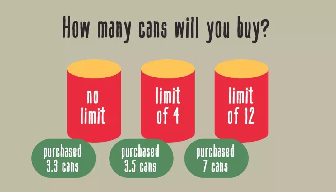 在這個測試當中,實驗人員會記錄用戶購買罐裝的湯,通常而言用戶會一次購買2到3罐,可是當實驗人員開始限制用戶的購買數量之后,用戶購買湯的數量則增加到了5到10灌,購買數量翻了2到3倍。