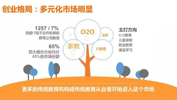 截止到2015年8月31日,IT桔子總共收錄1257家互聯網教育公司,在整體占比約7%,比例在其他諸行業中較為靠前。在細分方向上,在線教育創一個業的四大龍頭分別K12、兒童早教、職業教育、語言學習,它們總共囊括65%互聯網教育市場份額。