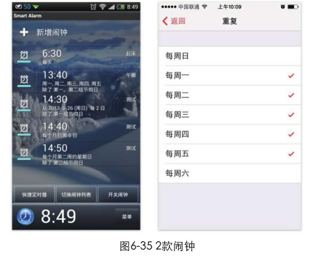 圖6-35所示為2款鬧鐘應(yīng)用。一款提供了非常強(qiáng)大的功能。在設(shè)置鬧鐘時可以有多種重復(fù)方式:每天、每周的某些日子、每周的某些日子和第N組節(jié)假日、僅第N組節(jié)假日、每隔N日、每月的某一日、每月第N周的某日,另一款只是簡單地讓用戶選擇每周幾重復(fù)。如果是你,會喜歡哪款呢?