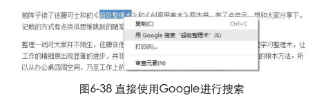 以前我們在瀏覽網(wǎng)頁時,看到一個想去了解更多的詞會怎么做呢?我在一篇文章中看到一本書,叫做《超級整理術(shù)》。我并不清楚這本書講了什么內(nèi)容,想去了解一下。于是我選中這幾個字,點(diǎn)擊鼠標(biāo)右鍵復(fù)制,在瀏覽器中新建個標(biāo)簽頁,打開Google,在搜索欄中右鍵粘貼,點(diǎn)擊"搜索”按鈕。經(jīng)過這一系列的操作之后,我終于在搜索結(jié)果頁中看到了關(guān)于這本書的簡介、評價、購買信息,等等。其實(shí)這整個過程也只是會耗費(fèi)幾十秒的時間,操作起來并不會覺得太難。直到有一天,我在使用Chrome瀏覽器的時候發(fā)在復(fù)制操作的下方,有一個"用Google搜索"XXX,"的選項(xiàng),只需點(diǎn)擊這一選項(xiàng),瀏覽器就會自動彈出一個標(biāo)簽頁,把我要的結(jié)果搜索出來。“選中-右鍵復(fù)制-新建窗口一打開網(wǎng)站-粘貼-搜索"這一復(fù)雜的過程就變成了"選中右鍵點(diǎn)擊Google搜索",只需2步,輕松完成任務(wù),如圖6-38所示。