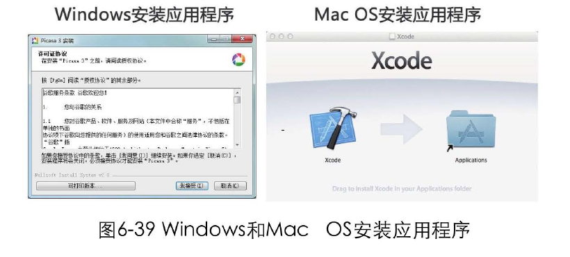 想想安裝應(yīng)用程序時Windows系統(tǒng)是怎么做的?讓你去閱讀安裝許可協(xié)議,選擇安裝在哪個盤中,不停地點(diǎn)擊下步,還有很多高級選項(xiàng)讓你去琢磨和修改。而在MacOS系統(tǒng)下,用戶僅需要簡單地拖拽,將應(yīng)用圖標(biāo)拖到Application文件夾中即可完成應(yīng)用程序的安裝。也許沒用過MacIOS的朋友永遠(yuǎn)都不會覺得在Windows中安裝軟件是件很麻煩的事,因?yàn)橐呀?jīng)習(xí)以為常了。但一旦用過這種簡單直接的安裝方式,便會由衷喜歡上它,如圖6-39所示。