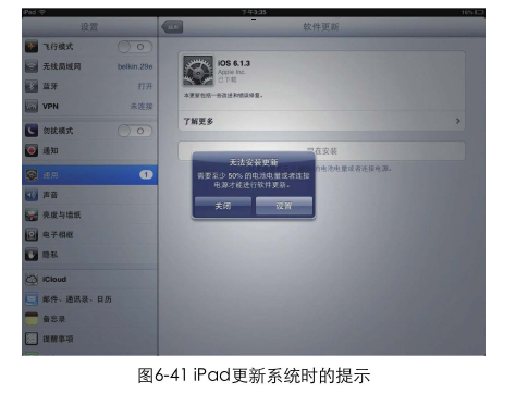 iPad在更新系統(tǒng)時,會提前檢測用戶的電量。如果電量不足以支撐完成更新,會提示用戶將iPod插上電源再來更新。試想一下,如果沒有這個提醒會怎樣呢?用戶花費(fèi)了大量的時間下載更新,在安裝到一半時卻因?yàn)闆]電而關(guān)機(jī)了!用戶需要連接電源再次重新更新,更新的過程雖然沒有冗余步驟,但因?yàn)槿鄙兕A(yù)先提示而導(dǎo)致的重復(fù)操作也會使操作流程變復(fù)雜,如圖6-41所示。