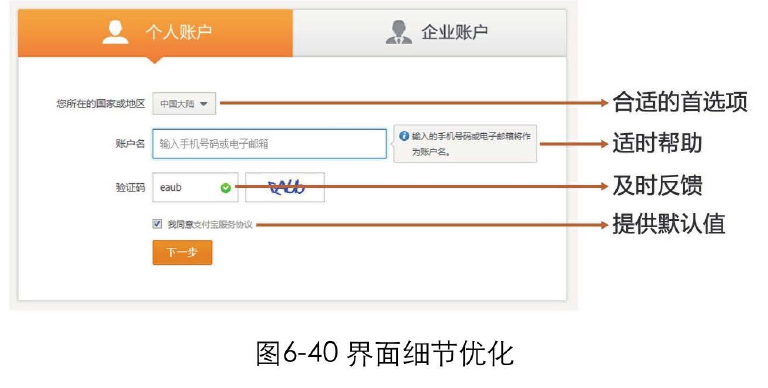 提供合適的選項(xiàng)、適時幫助、及時反饋、提供合理的默認(rèn)值,等等,這些細(xì)節(jié)的優(yōu)化,可以幫助用戶降低出錯幾率,使他們能夠更快、更順暢地完成任務(wù),如圖6-40所示。