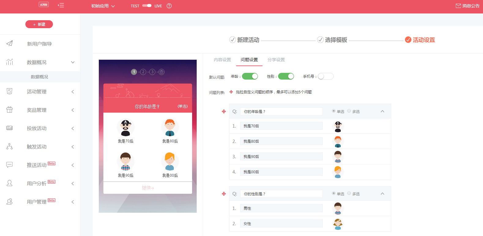 關于APP應用內的調查問卷活動,一般來說這種活動功能實現比較復雜,需要比較強大的技術,因此大部分的運營者會選擇第三方的APP活動運營工具去實現。比如活動盒子,針對APP應用的活動運營工具,可以通過用戶屬性標簽和APP用戶場景去觸發(fā)、推送以及投放各種應用內的活動,有效提高用戶活躍和留存率,刺激以老拉新。