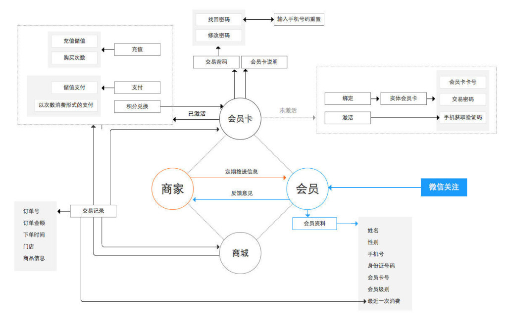 分兩個(gè)角色——商家和會(huì)員(消費(fèi)者),兩個(gè)場(chǎng)景——商城和會(huì)員卡。對(duì)于商家來(lái)說(shuō):通過(guò)商城為消費(fèi)者(會(huì)員)提供購(gòu)物消費(fèi)場(chǎng)地;對(duì)于會(huì)員(消費(fèi)者)來(lái)說(shuō):進(jìn)入商城就是消費(fèi)者,購(gòu)物消費(fèi)就是會(huì)員,消費(fèi)軌跡儲(chǔ)存在會(huì)員卡