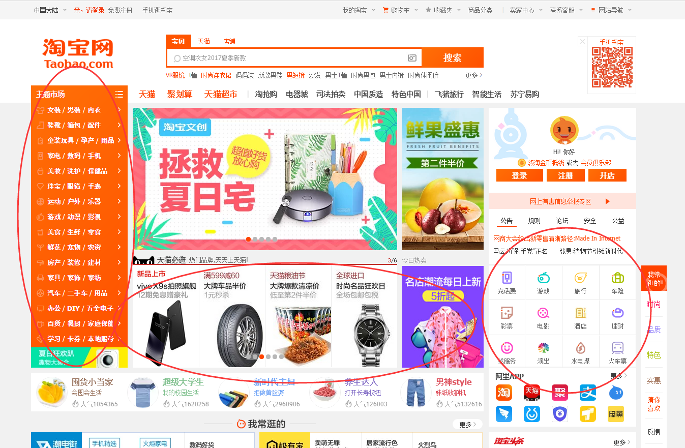 如今我們逛一些相當成熟的購物網(wǎng)站(比如淘寶)的時候,甚至比在百貨商廈中的感覺更清晰。我能更便捷地找到自己想要的東西。(商品分類,新品促銷,其他功能。。。)