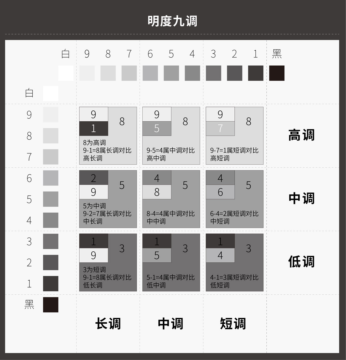 由此我們可以得到明度九調(diào):低短調(diào)、低中調(diào)、低長調(diào)、中短調(diào)、中中調(diào)、中長調(diào)、高短調(diào)、高中調(diào)、高長調(diào)。