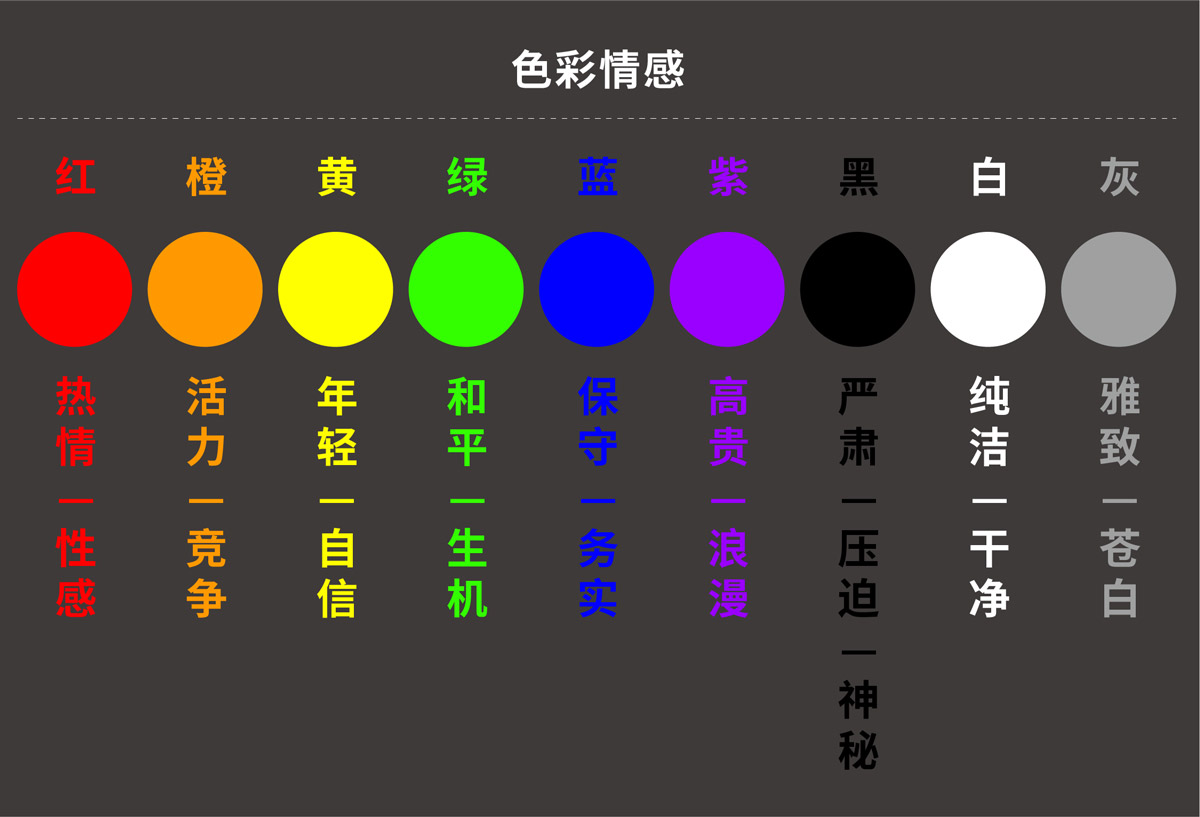 在色彩的情感表現(xiàn)中,色相決定了情感的基調(diào),明度確定強度,純度確定態(tài)度。純度越高,態(tài)度越積極,純度越低,態(tài)度越消極。