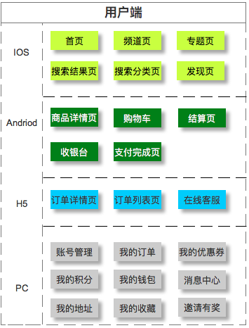 電商的用戶端主要功能是提供購買和商品展示,并能夠協助用戶進行個人服務管理。從用戶的階段來劃分,主要分成售前、售中、售后三個階段。其中個人信息的管理屬于貫穿整個使用過程。