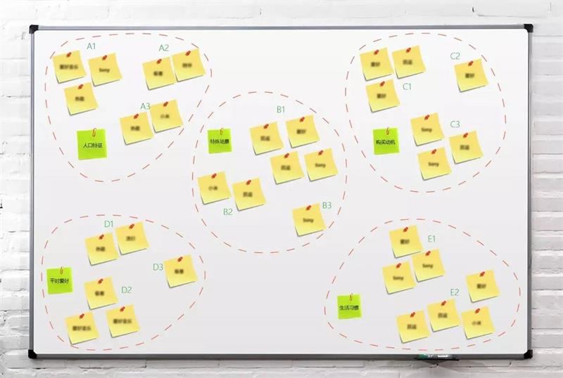 5.分類完畢后,便利貼會被簡單的分成幾個大類,讓參與者給這幾個大類命名,命名過程大家可以溝通達成統一,所有命名不一定涇渭分明、必須互斥,這樣就可以得出例如人口特征、特殊場景、購買動機等名稱的大類。有一些大類便利貼比較多的,可以讓他們再大類下面再劃分劃分小類。