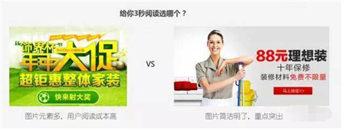 信息流廣告展示環(huán)境相對(duì)復(fù)雜環(huán)境,在眾多信息轟炸下,用戶注意力十分分散,因此,我們廣告要讓用戶能在第一時(shí)間了解到廣告所所傳遞的信息,挑選最有價(jià)值的唯一賣點(diǎn),必須用最簡(jiǎn)潔的設(shè)計(jì)方式呈現(xiàn),讓用戶在3秒內(nèi)即可明白產(chǎn)品的核心價(jià)值。
