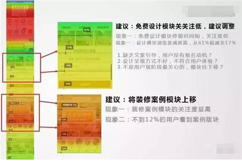 但在大流量引入的情況下,還需要對(duì)頁(yè)面轉(zhuǎn)化率進(jìn)行微迭代,哪怕只要提升0.5%的轉(zhuǎn)化率,都可能直接節(jié)省好幾十萬(wàn)的推廣費(fèi)用,我選擇利用ptengine進(jìn)行熱力圖監(jiān)測(cè),比如這個(gè)頁(yè)面,用戶在瀏覽到第二屏便從61%流失剩下17%了,客戶為什么會(huì)如此快速的流失,是否因?yàn)檫^(guò)早引入轉(zhuǎn)化板塊,引起用戶反感?用戶停留時(shí)間最長(zhǎng)的兩個(gè)板塊分別是頭圖和設(shè)計(jì)案例板塊,是否可以考慮把用戶關(guān)心的內(nèi)容往上移?帶著這個(gè)假設(shè)進(jìn)行調(diào)整,便可對(duì)頁(yè)面進(jìn)行微迭代,把假設(shè)得以驗(yàn)證。