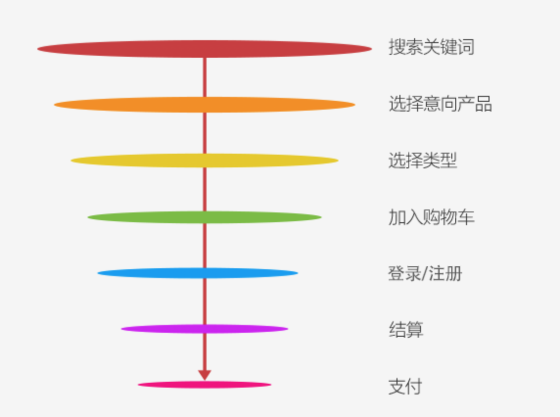 以未注冊或未登錄用戶搜索購物轉化為例,漏斗模型為用戶購物流程所要經過的核心流程步驟,用戶在流程的走向過程中是逐漸減少的,我們要做的是減少每一個步驟的中用戶的流失率。