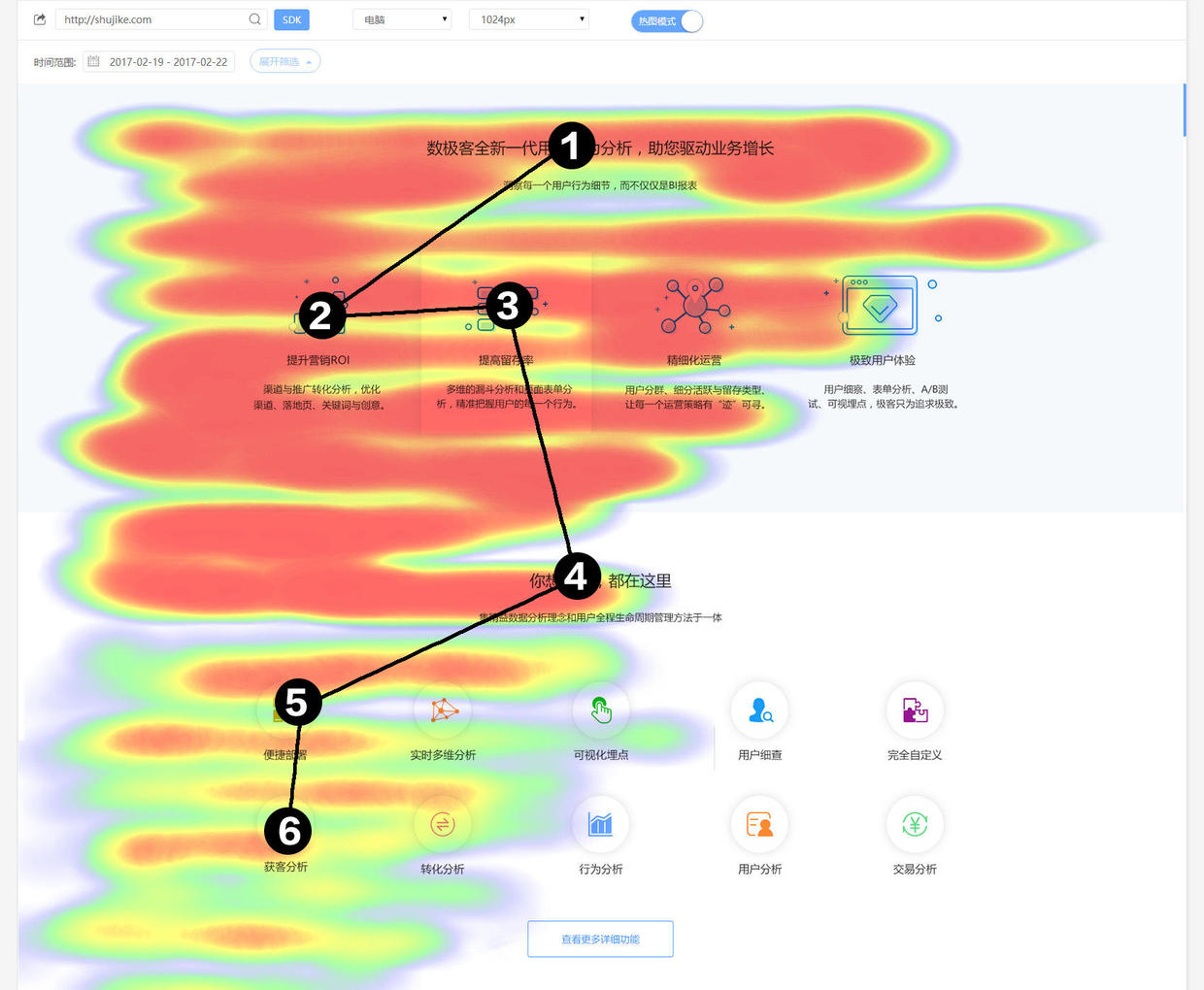 痛點路徑并不是由規模數據智能繪制的一張圖,而是需要結合用戶的痛點和視覺走向手動繪制,紅色區域代表用戶最為關注的痛點,數字和線條代表用戶關注痛點的視覺路徑。