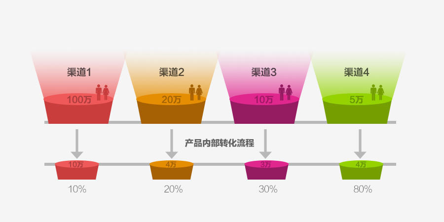 上圖中,假設四種渠道在資金及人力投入相同的情況下,并且都能拉到10萬用戶(為了方便理解,都用簡單的整數),渠道1的轉為率為10%,渠道4的轉化率為80%,那么在對比了四個渠道后,我們應該做的是加大渠道4的投入減少渠道1的投入。