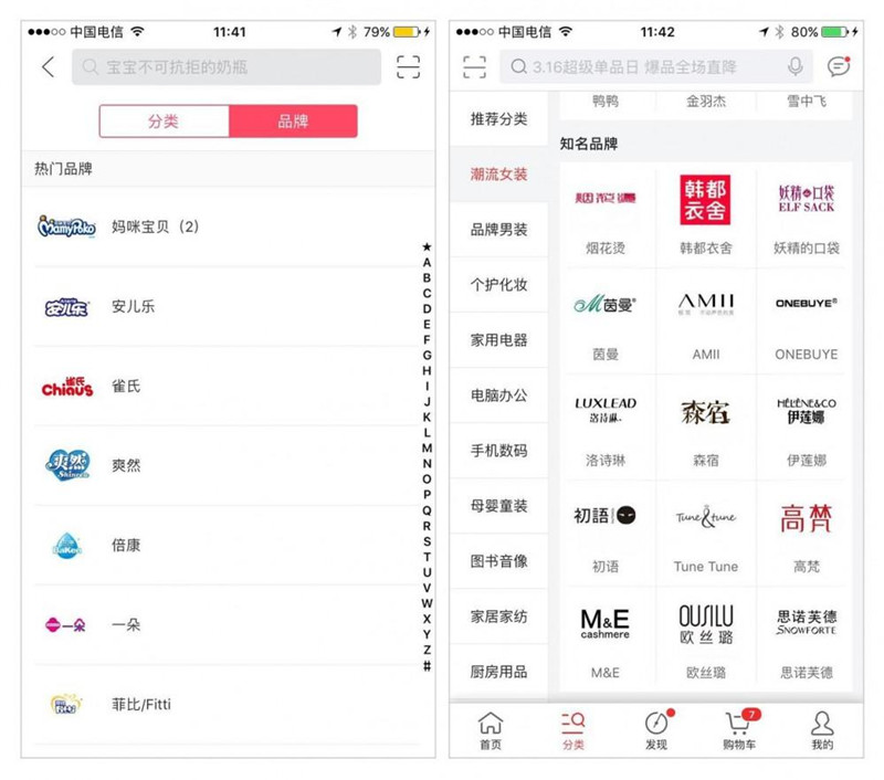 隨著消費(fèi)水平的提高,品牌因素對(duì)用戶選購商品會(huì)占有越來越大的比重,按照品牌來分類也越來越多的出現(xiàn)在購物類的app中,如圖中左邊的例子,可以直接品牌列表來查找自己的要找的品牌;右邊的例子在一級(jí)類目下面集成了品牌推薦,這也是對(duì)用戶思路的一種引導(dǎo)方式。