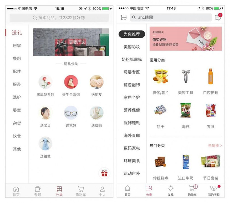 在分類導(dǎo)航的邏輯中,按照商品屬性分類式最基本的分類方式,但并不是唯一的方式,我們可以嘗試以商品屬性分類為基礎(chǔ)+其他緯度分類結(jié)合的方式,以求能夠覆蓋更多的用戶使用場(chǎng)景,響應(yīng)更多的用戶需求;分類導(dǎo)航頁還漸漸的成為運(yùn)營活動(dòng)的展示窗口,針對(duì)類目的運(yùn)營活動(dòng)在這里放置一個(gè)入口再合適不過了。例如下圖左邊的案例,增加了以商品使用場(chǎng)景(送禮)為緯度的分類,和以商品屬性為緯度的分類并列成為一級(jí)類目;下圖右邊的案例就針對(duì)該類目放置了專題活動(dòng)(值得買好物)的入口。