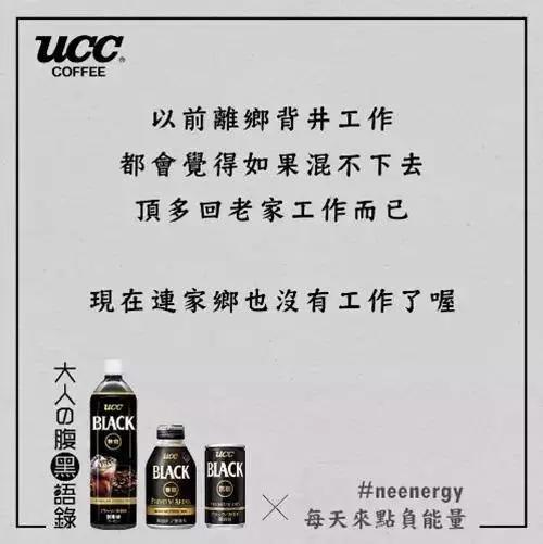 傳遞正能量的雞湯文一直發揮功效,喪茶的喪文化余熱也還在。如早在去年就有一款名叫UCC咖啡的日本咖啡打出#每天來點負能量#的口號,先來三款海報文案欣賞一下: