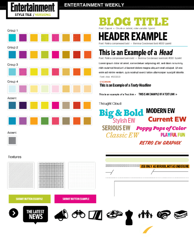 樣式圖塊可以在前期建立視覺(jué)方向,而又不用設(shè)計(jì)完整的設(shè)計(jì)稿。它通過(guò)前期調(diào)研的情緒版演化而來(lái)。通過(guò)文字、顏色,排版,造型,質(zhì)感等方向,建立一個(gè)由各種樣式圖塊組成的頁(yè)面。通過(guò)該頁(yè)面,可以和利益相關(guān)者交流視覺(jué)的各個(gè)方面,而又不用浪費(fèi)時(shí)間去直接出設(shè)計(jì)稿,進(jìn)行快速的反饋和討論。