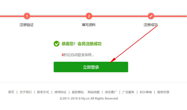 5. 點擊立即注冊后,提示注冊成功,10秒內會自動登陸會員中心,也可以點擊立即登陸,進入會員中心.