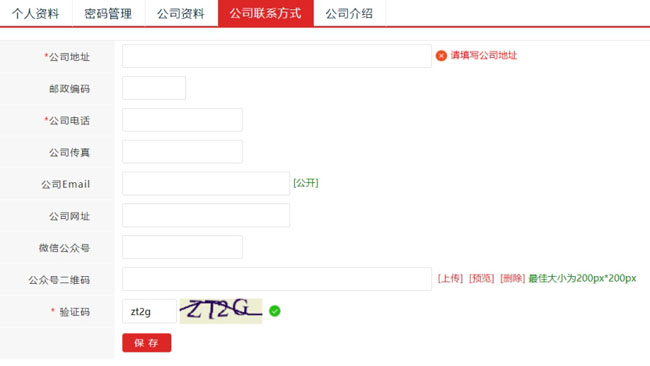 11. 填寫公司聯系地址,這個也會直接展示在網站的聯系方式里面.沒有公司座機電話的,可以填寫手機號.公眾號二維碼,也可以上傳個人微信二維碼.填寫完成后,選擇保存.