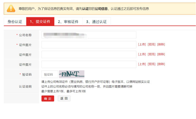 17. 現在我們去發布產品,發布產品前,必須要上傳公司的資質材料,進行審核.第一欄證件圖片,上傳營業執照副本彩色掃描件,第二欄,可以上傳其它資質文件.輸入驗證碼后,等待平臺審核.