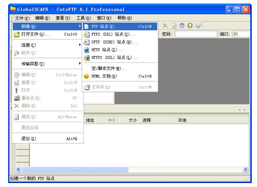 2.2.2、選擇“文件”->“新建”->“FTP站點(diǎn)”,如下圖: