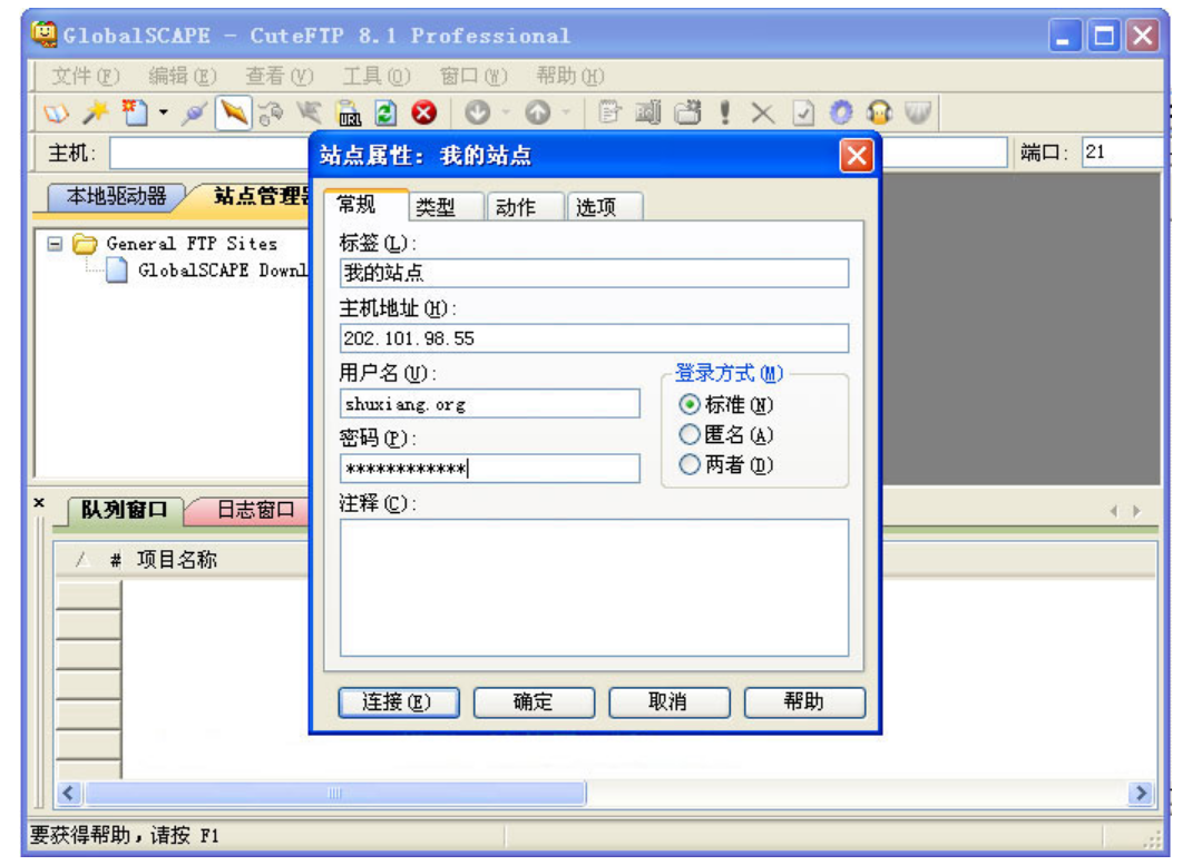 2.2.3、在彈出站點(diǎn)對(duì)話框里面輸入“標(biāo)簽”名稱,例如:我的站點(diǎn);在“主機(jī)地址”輸入FTP的IP地址,例如:8.8.8.8; 并輸入用戶名和密碼,例如:abc.com,點(diǎn)擊“確定”或者“連接”,如下圖: