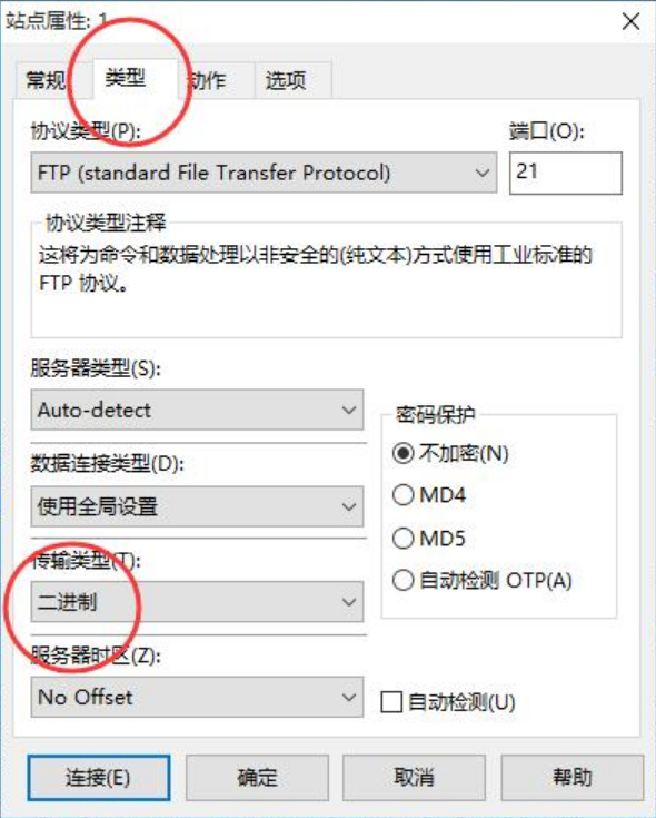 需要特別注意的是,傳輸類型一定要設(shè)置為二進(jìn)制,否則會(huì)導(dǎo)致傳輸文件出錯(cuò),造成網(wǎng)站無(wú)法訪問(wèn)。