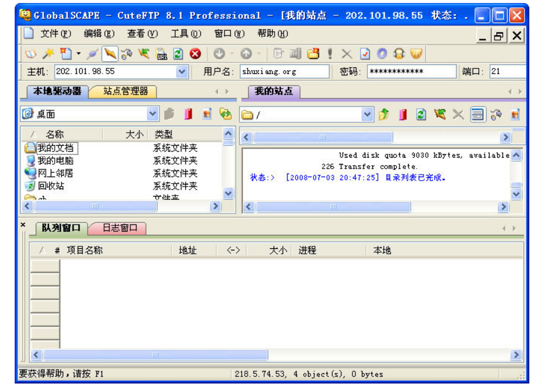 2.2.5、在左側(cè)為本地驅(qū)動(dòng)器,右側(cè)“我的站點(diǎn)”為FTP目錄,若使用我司的空間網(wǎng)頁(yè)文件程序及圖片上傳到wwwroot目錄里面即可。