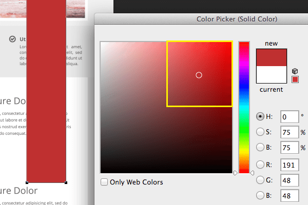 你一旦選擇了高亮的顏色,從該點移動滑塊來選擇接下來的顏色。在你的設計中也需要其他的顏色,高亮色的稍微變化會讓你的顏色選擇變得簡單。