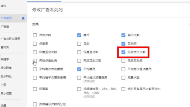 首先選擇廣告系列,我們也可以分別查看每個廣告系列的數據,或者還可以選擇不同時間段來看相關數據。點擊列;,選擇修改列;,再選擇效果;,添加無效點擊次數;,和無效點擊比例;,最后按應用;,這樣就做好啦!這兩列將會幫助你監測你廣告系列的無效點擊情況,無效點擊次數;這一列顯示在指定時間內的無效點擊數目。