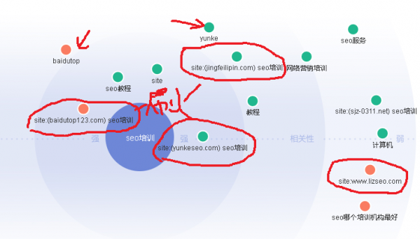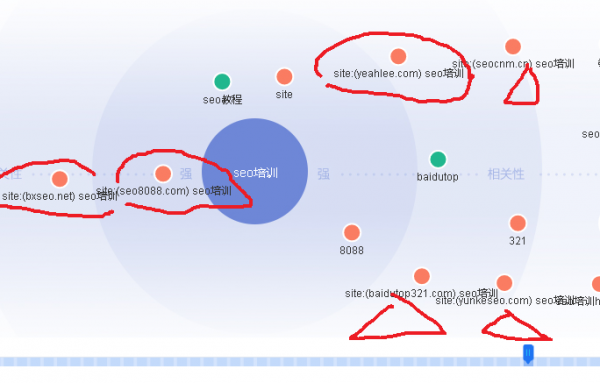 圓形圈起來的,在圖譜中存在的時間比較短,來回動一下橫條的時間表查看,這幾個站沒有任何排名。而三角形指出來的幾個域名卻長期存在于需求圖譜中,拉動橫條可以看到這幾個域名雖然位置變動了,但是依然存在靠中心的位置,這幾個站一直排在SEO培訓首頁。