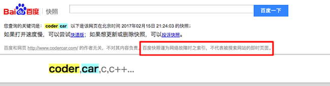 例如搜索『codercar.com』出來的百度快照截圖,請注意紅框部分的描述。