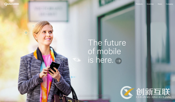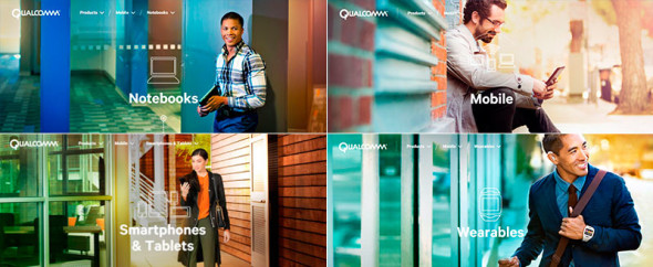 美國高通網站的品牌宣傳圖片讓人印象深刻,品牌特點獨樹一熾,顏色上運用冷暖搭配,加以漸變效果巧妙地疊加于圖片上,雖然顏色種類不多,但能在風格、品牌上具有強烈的統一性,讓人對品牌辨識度有更加深刻的記憶性。
